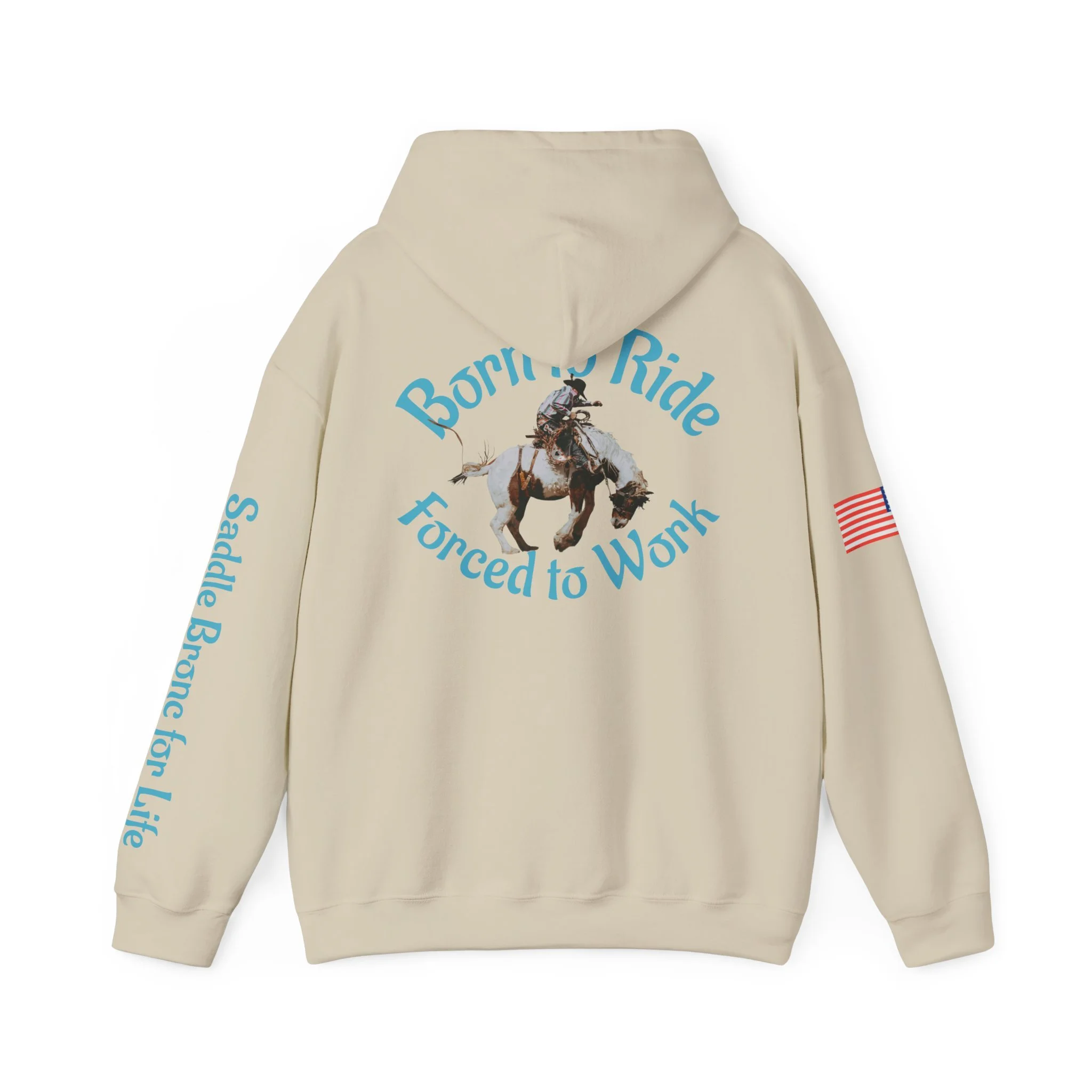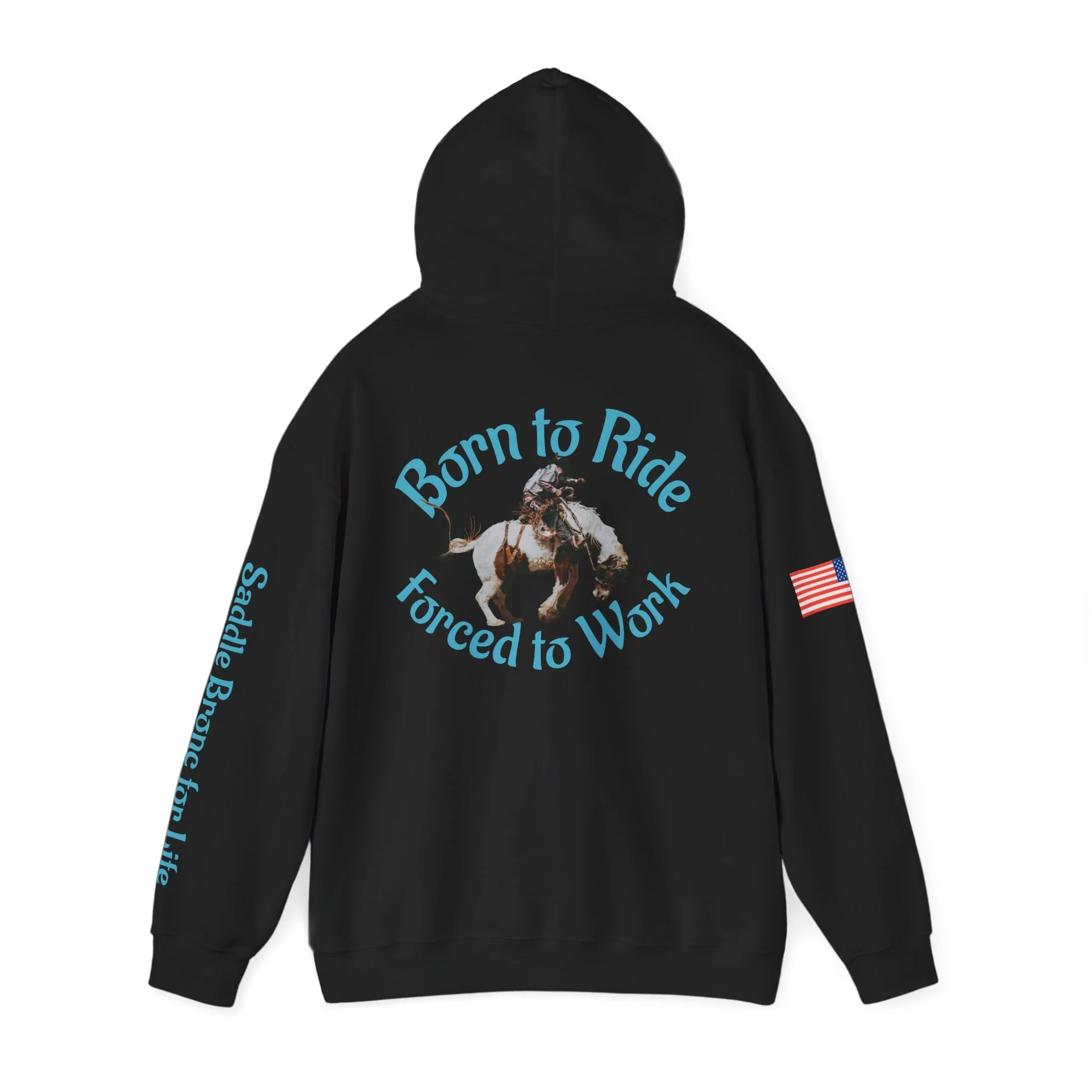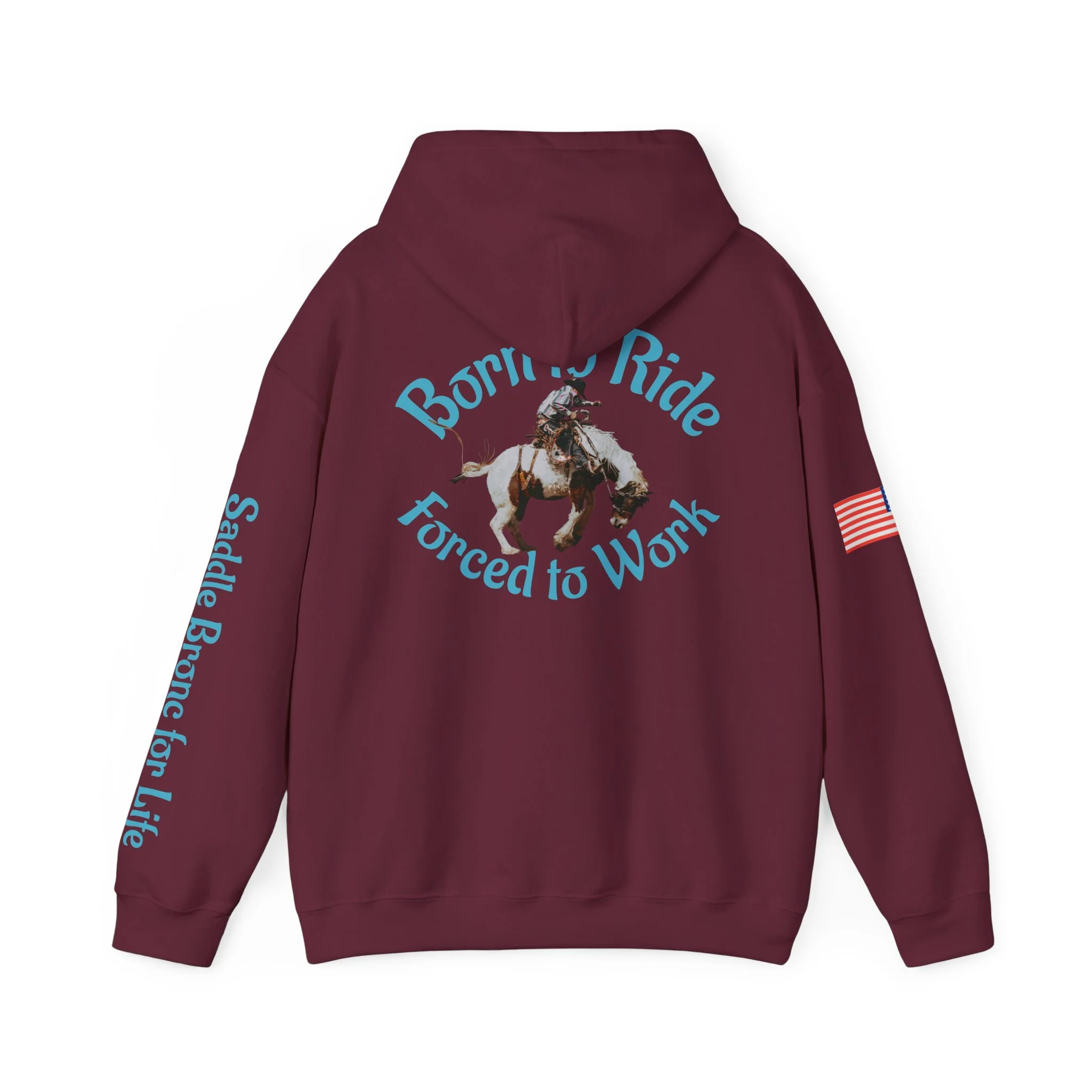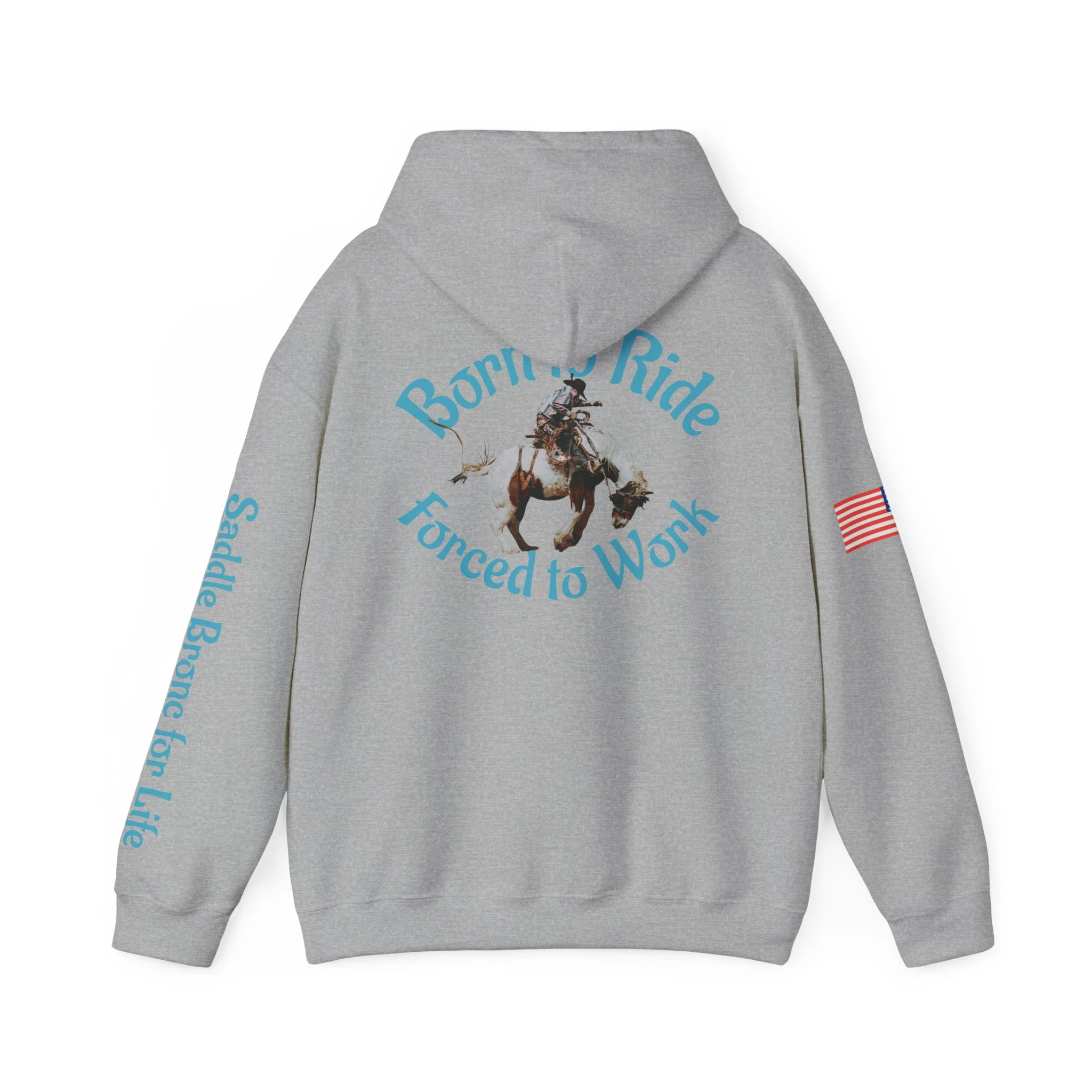 This cozy hooded sweatshirt brings western grit to everyday wear. A soft, medium-heavy fleece drapes comfortably while the double-lined hood and color-matched drawcord add structure and subtle style. Teal western-inspired graphics wrap the piece — a small chest motif up front, bold “Born to Ride / Forced to Work” artwork across the back, and script down the sleeve that reads like a rancher’s motto. An American flag patch on the arm and roomy kangaroo pocket make this hoodie practical for long days outside or late-night bonfires. The fit is classic and relaxed, built from a 50/50 cotton-poly blend that keeps its shape and holds vibrant DTF/DTG prints. Wear it after a ride, on chores around the property, or layered for crisp mornings when you need something durable and familiar.