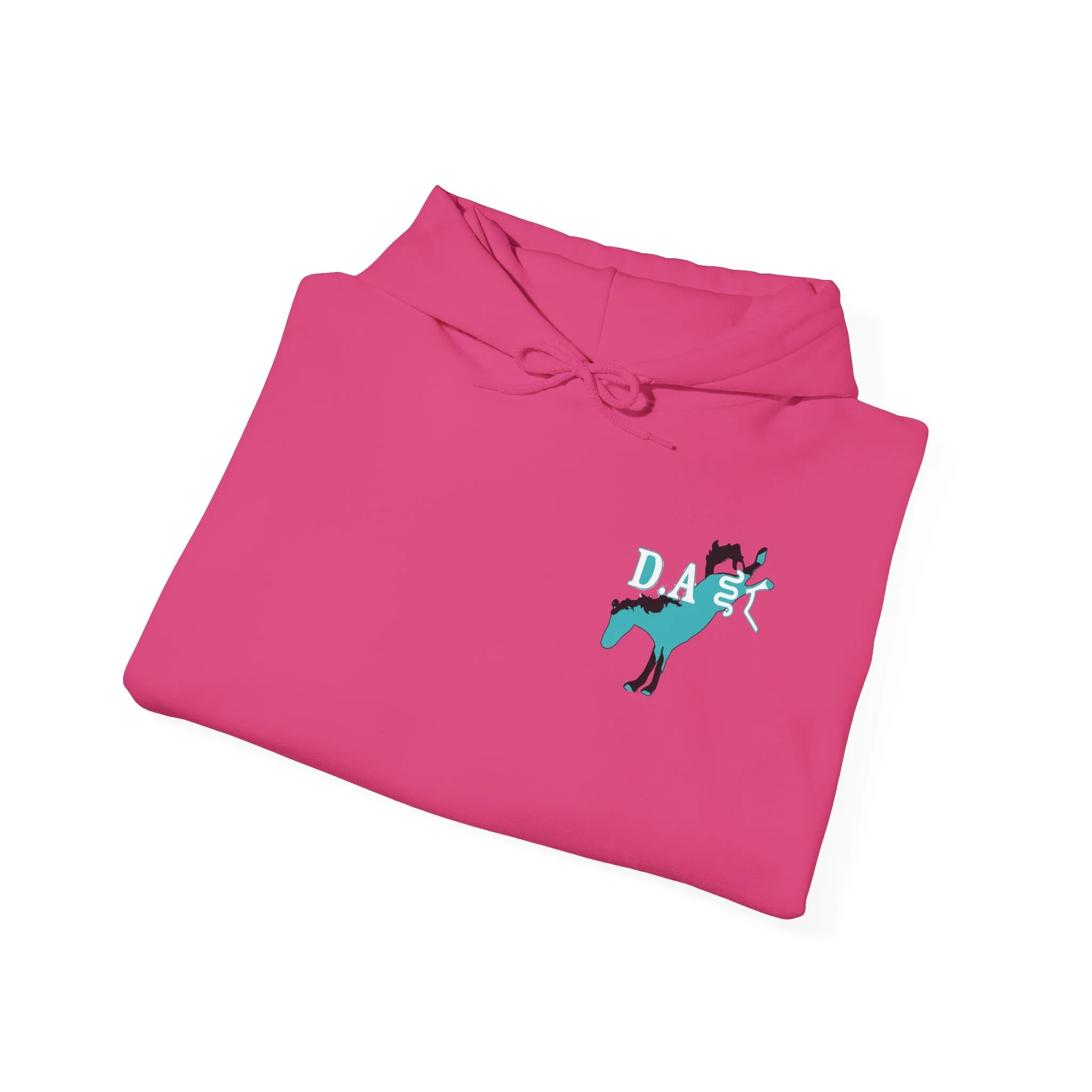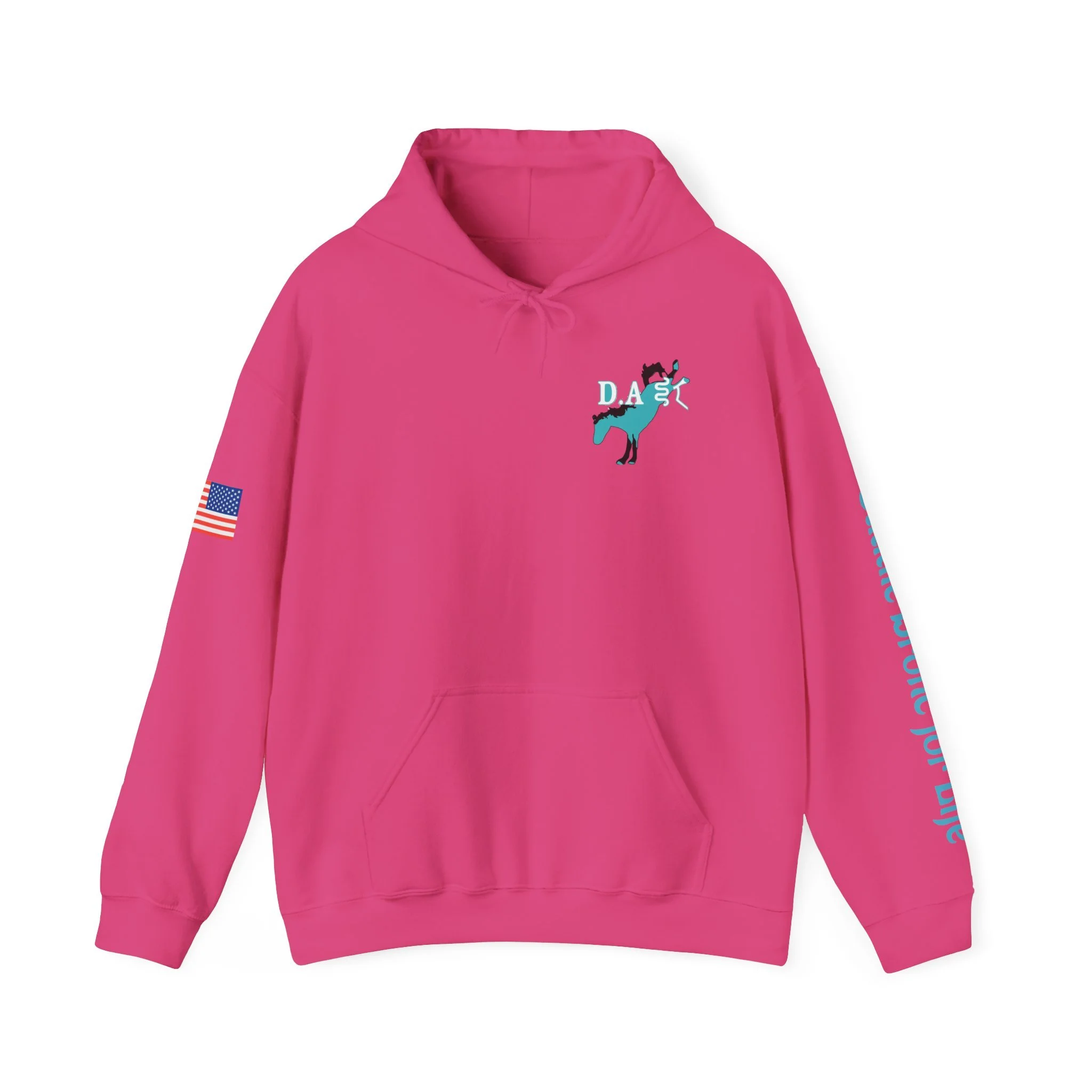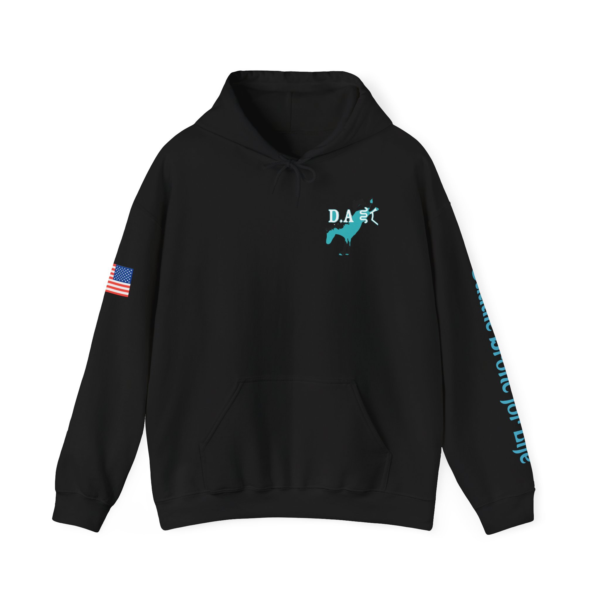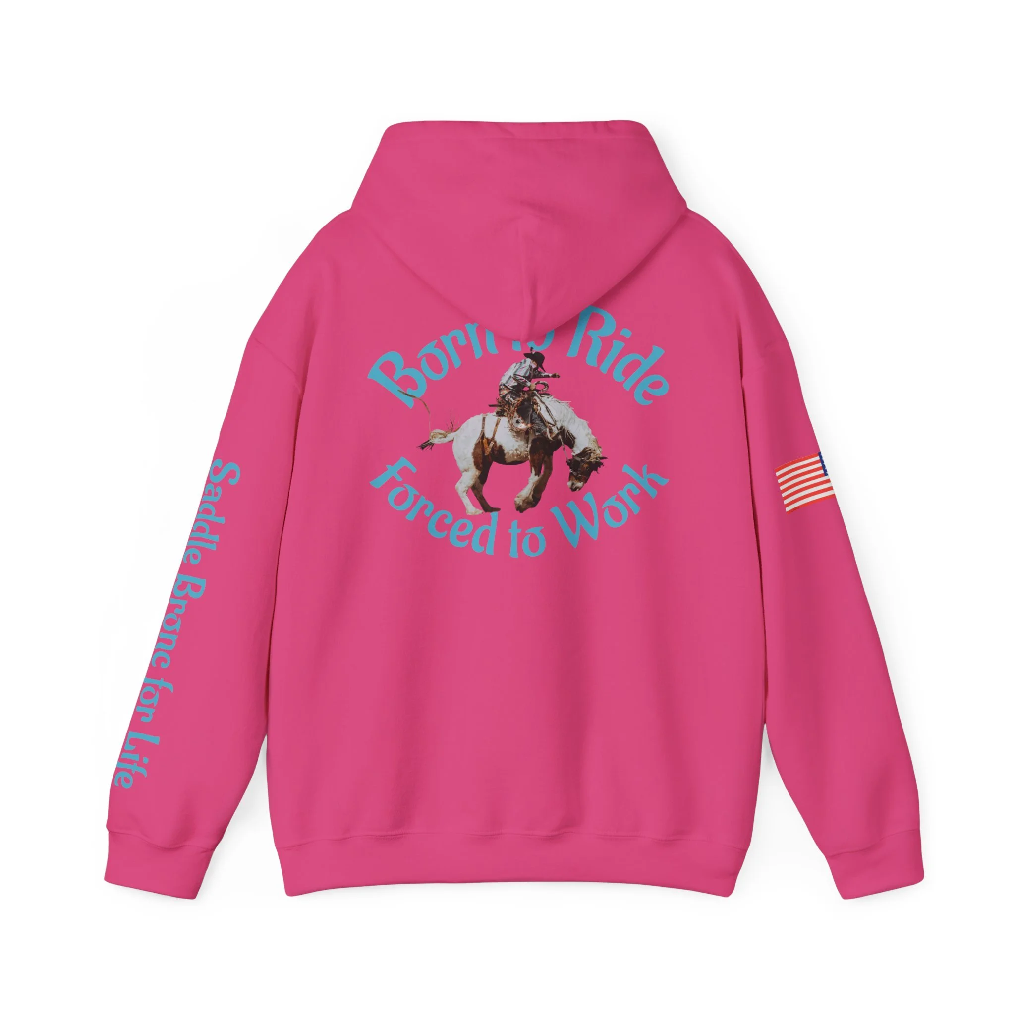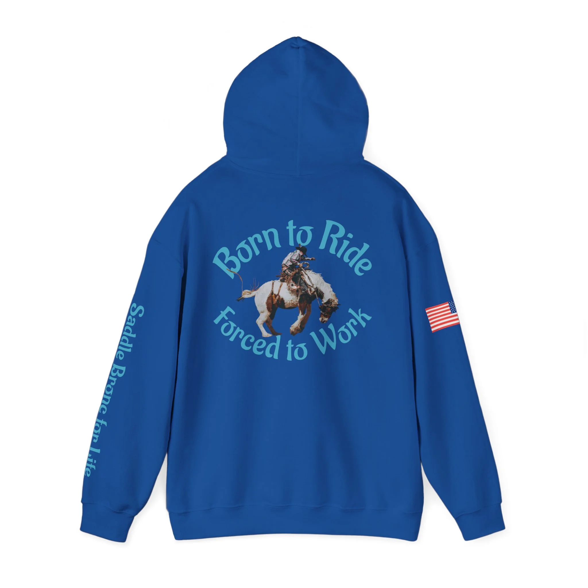 This cozy hooded sweatshirt brings western grit to everyday wear. A soft, medium-heavy fleece drapes comfortably while the double-lined hood and color-matched drawcord add structure and subtle style. Teal western-inspired graphics wrap the piece — a small chest motif up front, bold “Born to Ride / Forced to Work” artwork across the back, and script down the sleeve that reads like a rancher’s motto. An American flag patch on the arm and roomy kangaroo pocket make this hoodie practical for long days outside or late-night bonfires. The fit is classic and relaxed, built from a 50/50 cotton-poly blend that keeps its shape and holds vibrant DTF/DTG prints. Wear it after a ride, on chores around the property, or layered for crisp mornings when you need something durable and familiar.