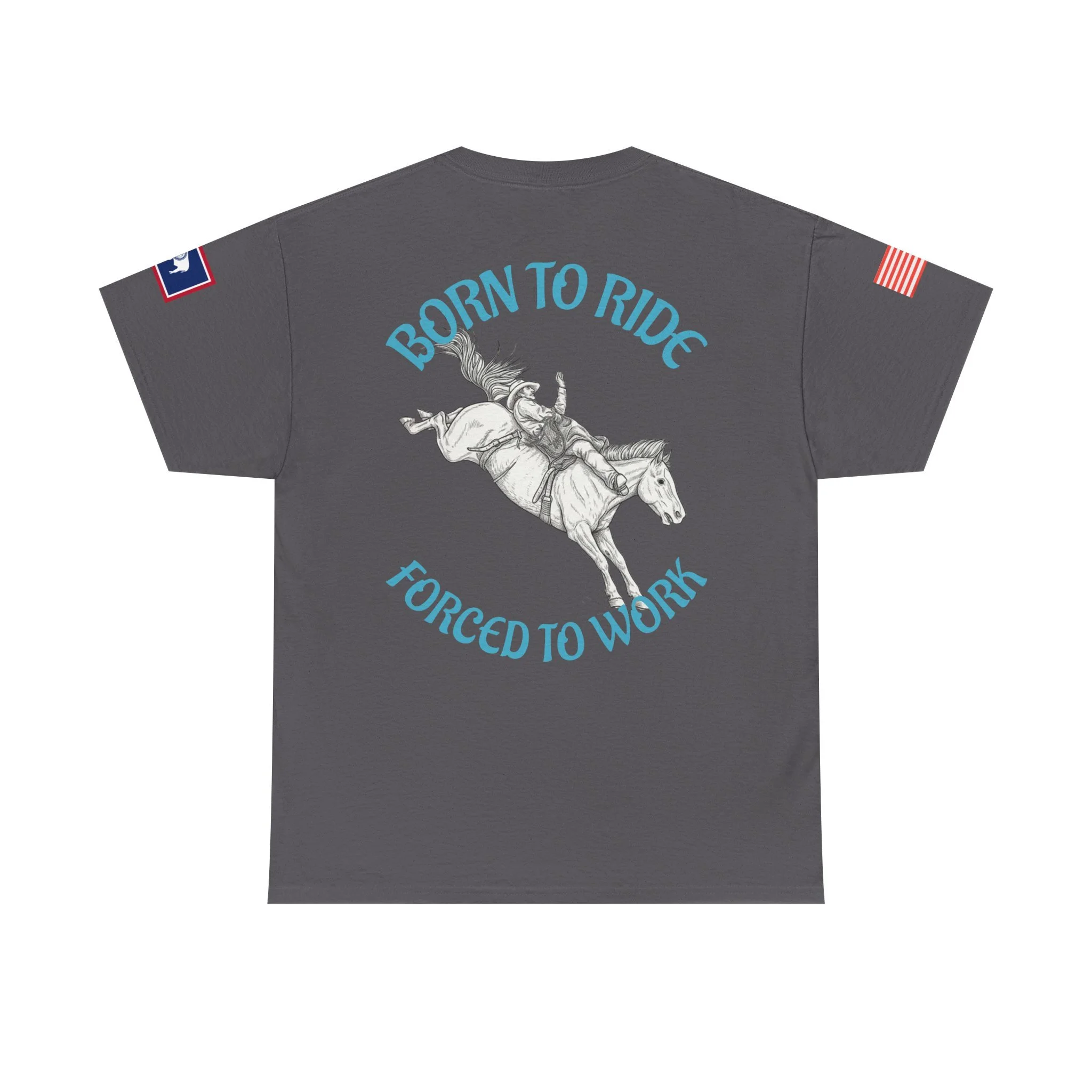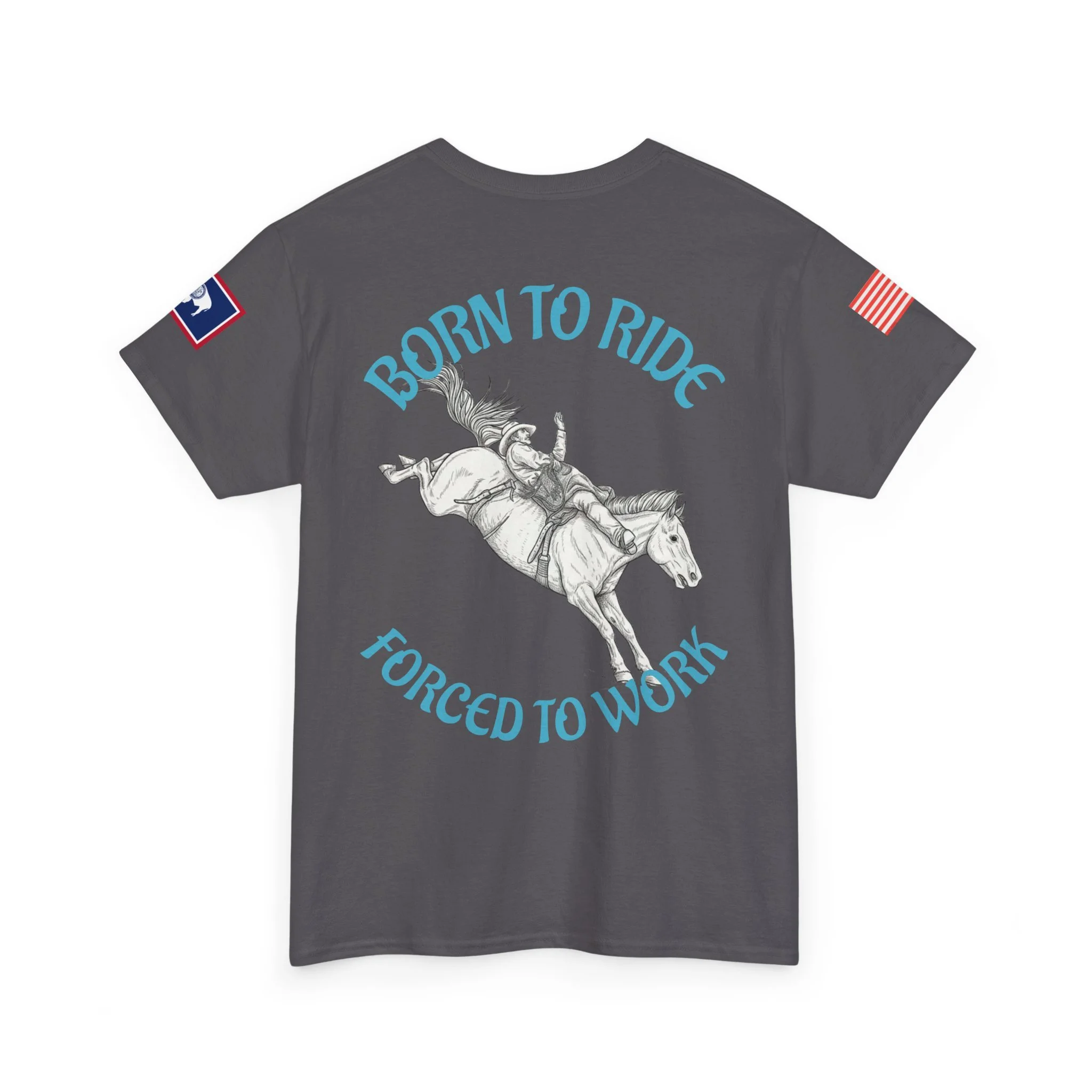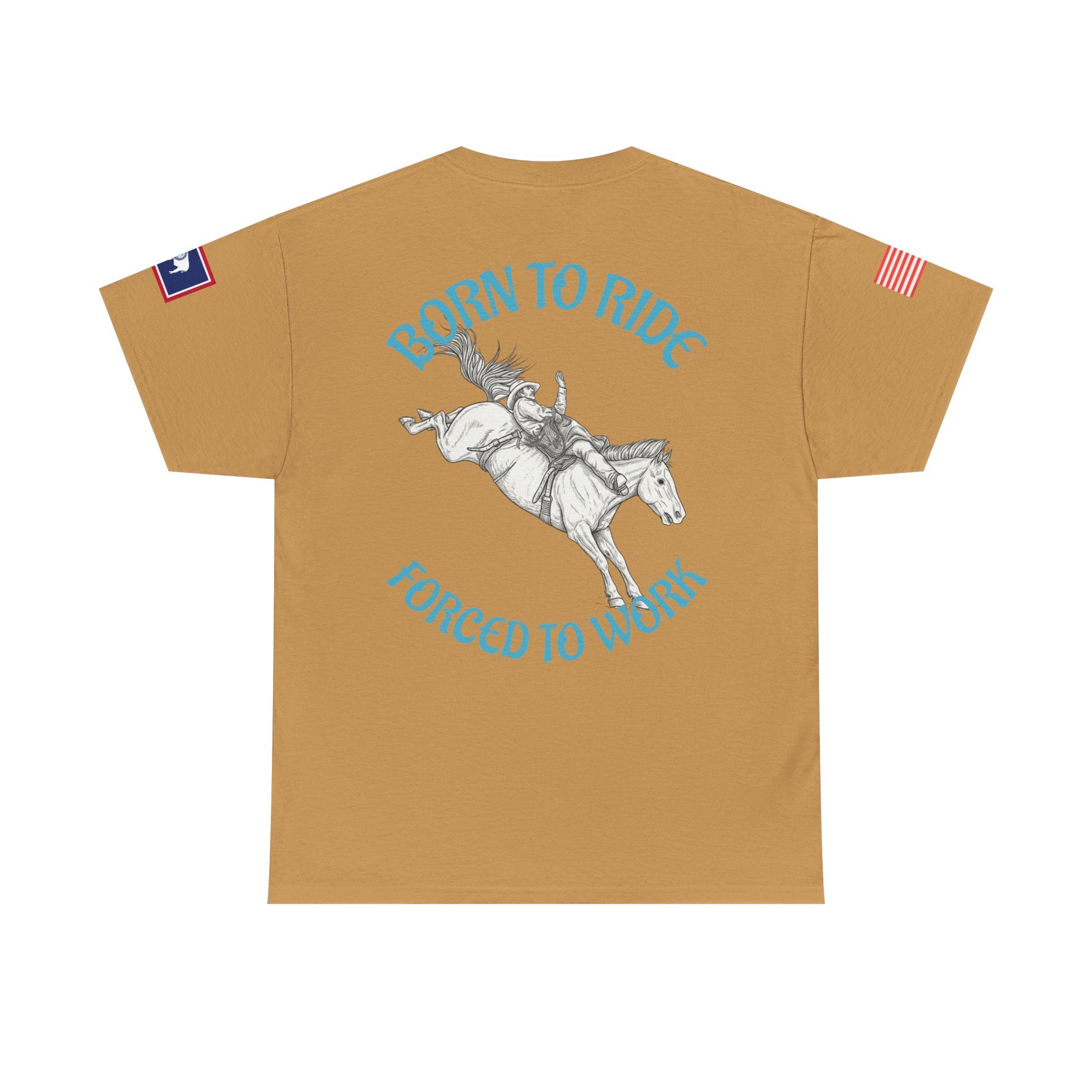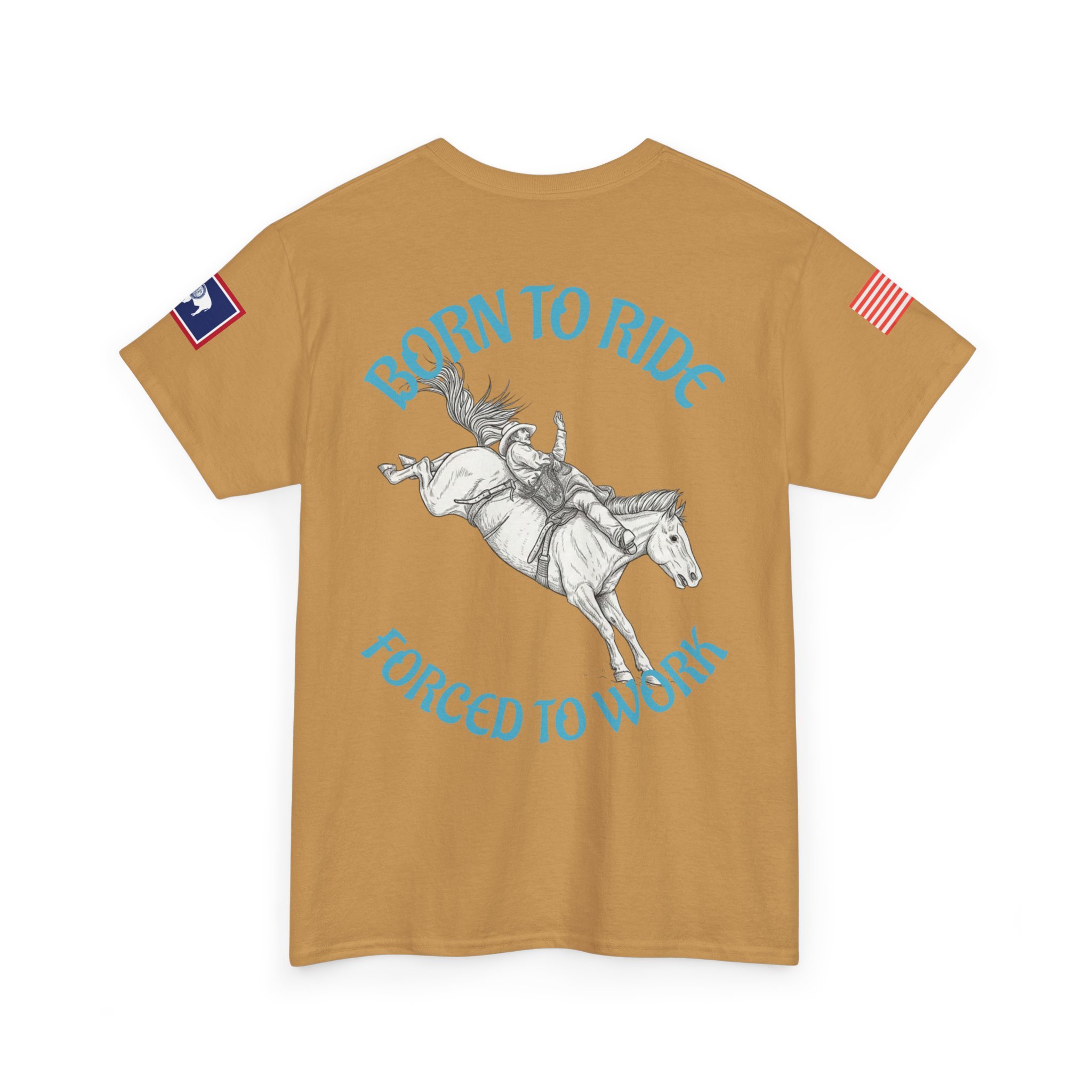 This soft, classic-fit tee carries a spirit of open country and quiet rebellion. A vintage rodeo illustration arcs across the back with the slogan “Born to Ride / Forced to Work,” while a small chest graphic and subtle sleeve patches add lived-in, ranch-ready detail. The medium-weight cotton feels substantial without being stiff, and the crew neckline and roomy cut make it easy to throw on for a weekend trail ride, a coffee run after dawn chores, or a backyard hangout. It wears like a favorite from day one—faded, durable, and full of character.