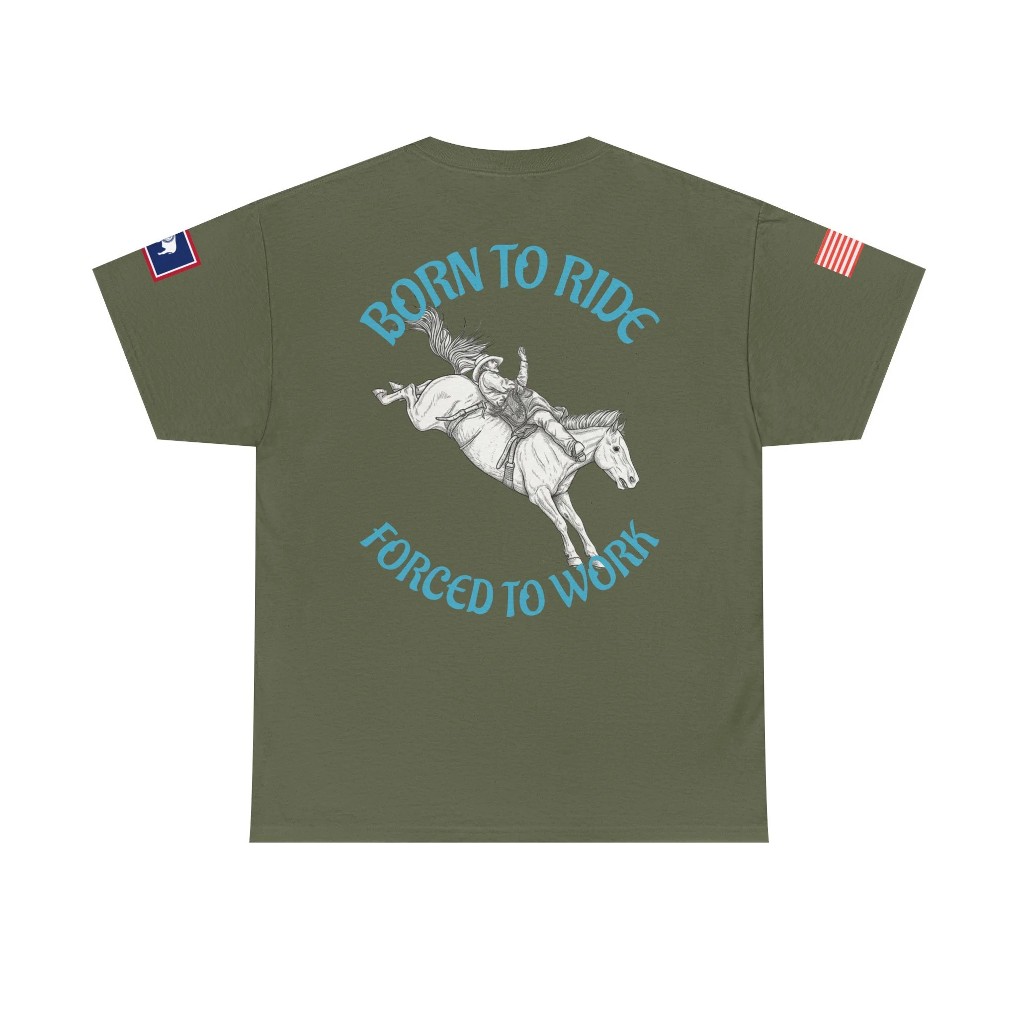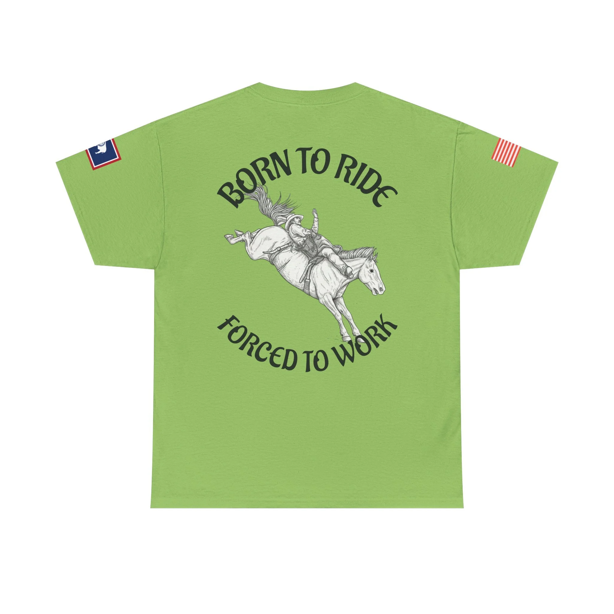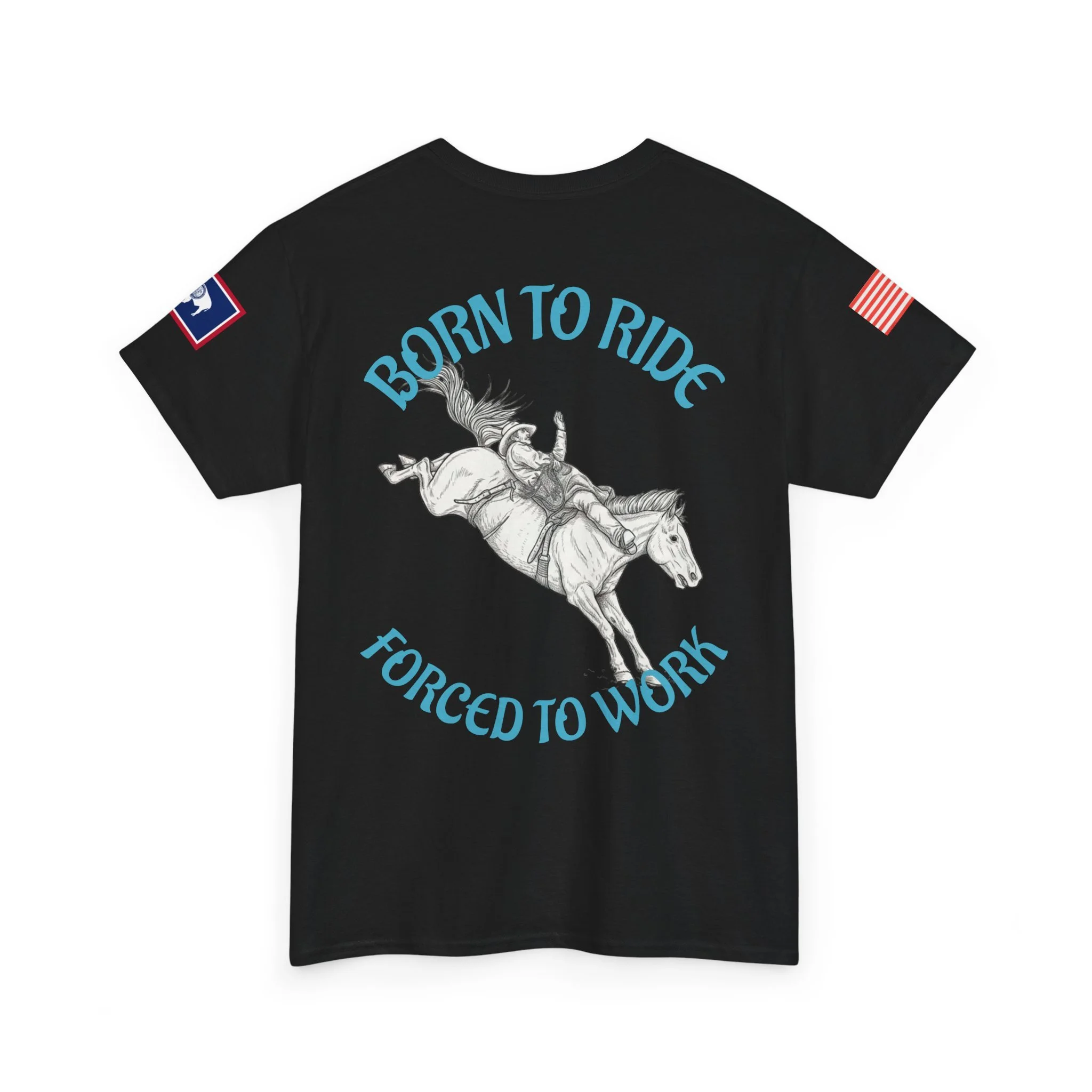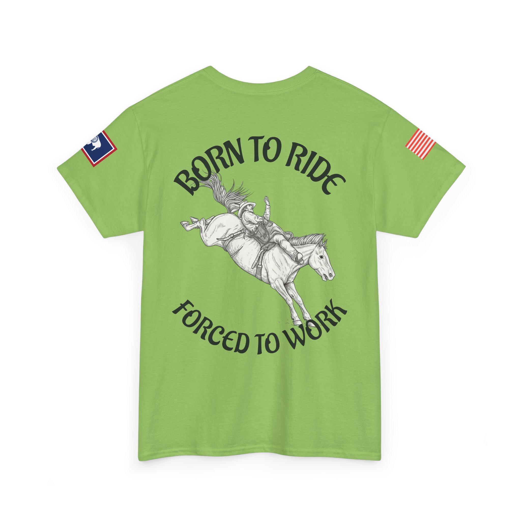 This soft, classic-fit tee carries a spirit of open country and quiet rebellion. A vintage rodeo illustration arcs across the back with the slogan “Born to Ride / Forced to Work,” while a small chest graphic and subtle sleeve patches add lived-in, ranch-ready detail. The medium-weight cotton feels substantial without being stiff, and the crew neckline and roomy cut make it easy to throw on for a weekend trail ride, a coffee run after dawn chores, or a backyard hangout. It wears like a favorite from day one—faded, durable, and full of character.