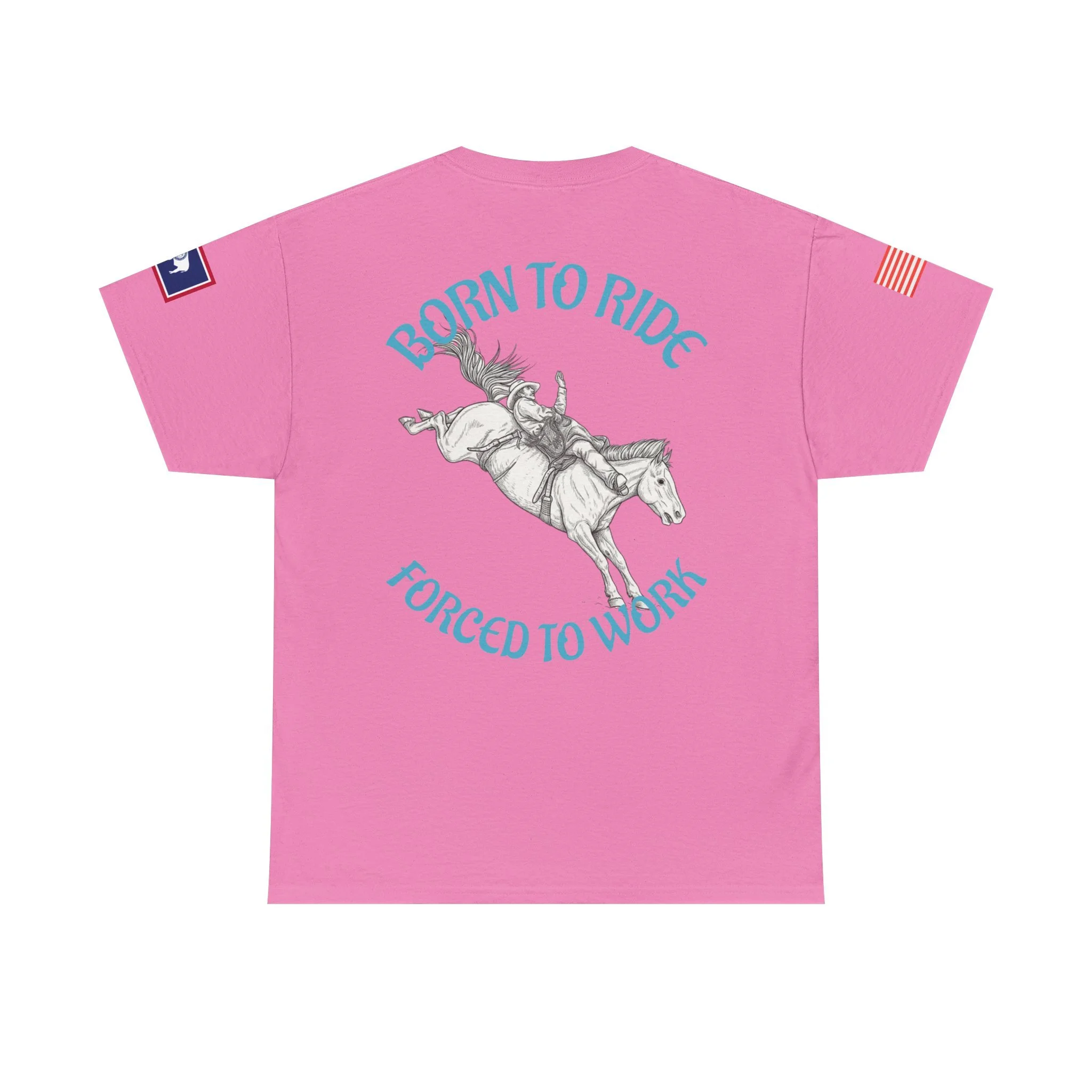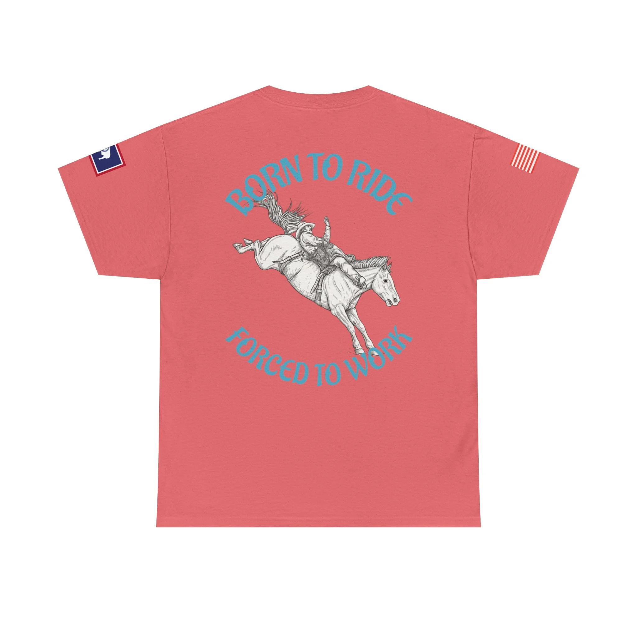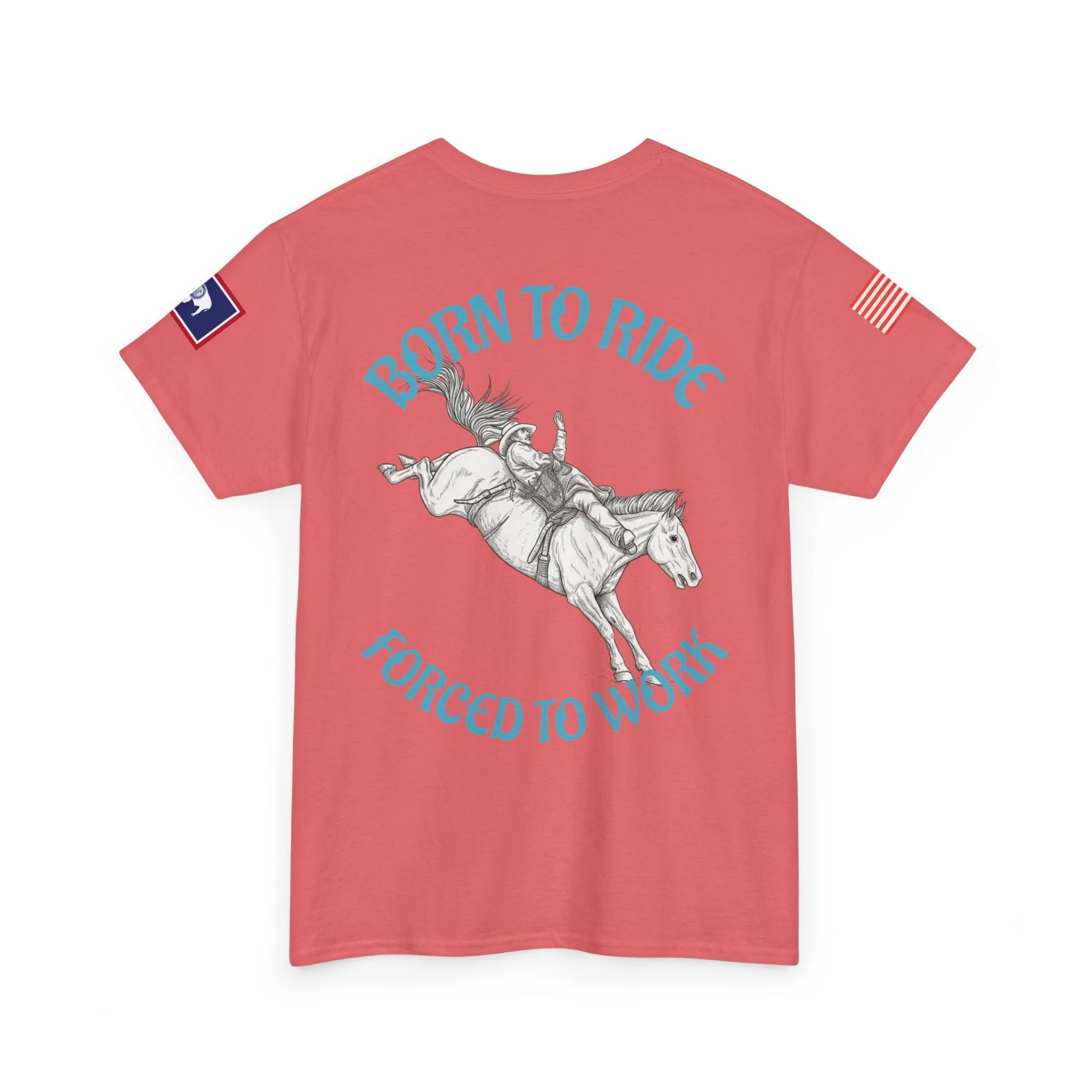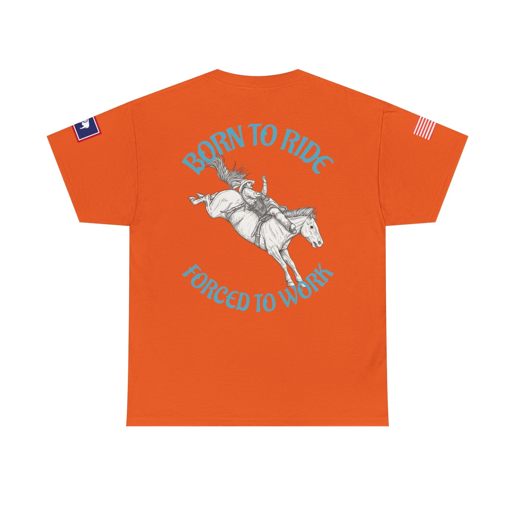 This soft, classic-fit tee carries a spirit of open country and quiet rebellion. A vintage rodeo illustration arcs across the back with the slogan “Born to Ride / Forced to Work,” while a small chest graphic and subtle sleeve patches add lived-in, ranch-ready detail. The medium-weight cotton feels substantial without being stiff, and the crew neckline and roomy cut make it easy to throw on for a weekend trail ride, a coffee run after dawn chores, or a backyard hangout. It wears like a favorite from day one—faded, durable, and full of character.