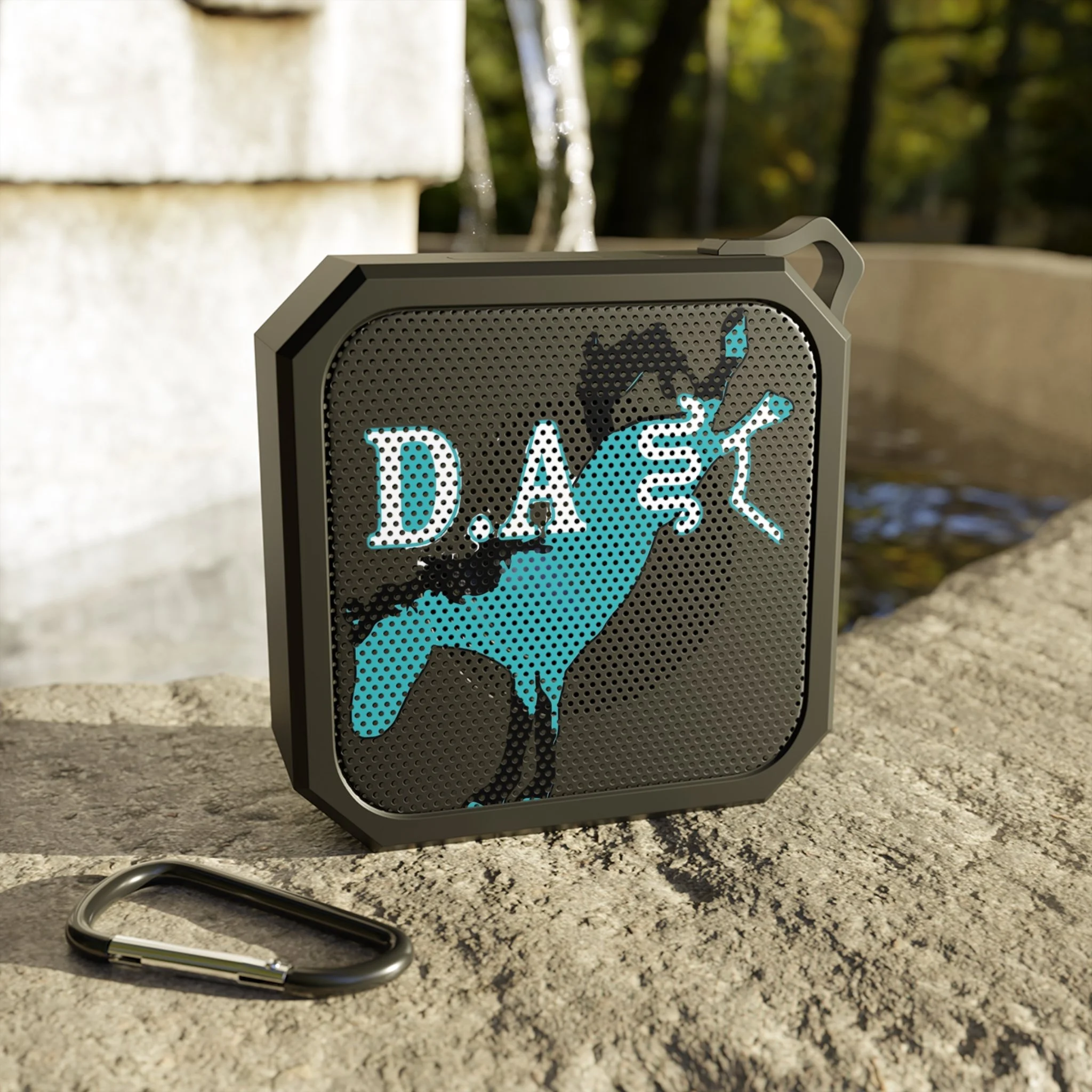 A rugged, pocket-sized Bluetooth speaker with personality — built for outdoor hangs, trail-side beats, and wet-weather playlists. Its IPX6 water-resistant shell and ABS construction shrug off splashes and dirt while the included carabiner clips easily to packs, belts, or bike frames. The compact 3W driver fills small spaces with clear sound, and Bluetooth 5.0 keeps your connection steady up to about 33 feet. Charge quickly in 1.5 hours and enjoy up to two hours of loud playback; onboard controls and a built-in mic make switching tracks and taking calls effortless. The bold turquoise graphic on the grill gives this little speaker a distinctive, adventurous look — made for people who take music with them wherever they roam.