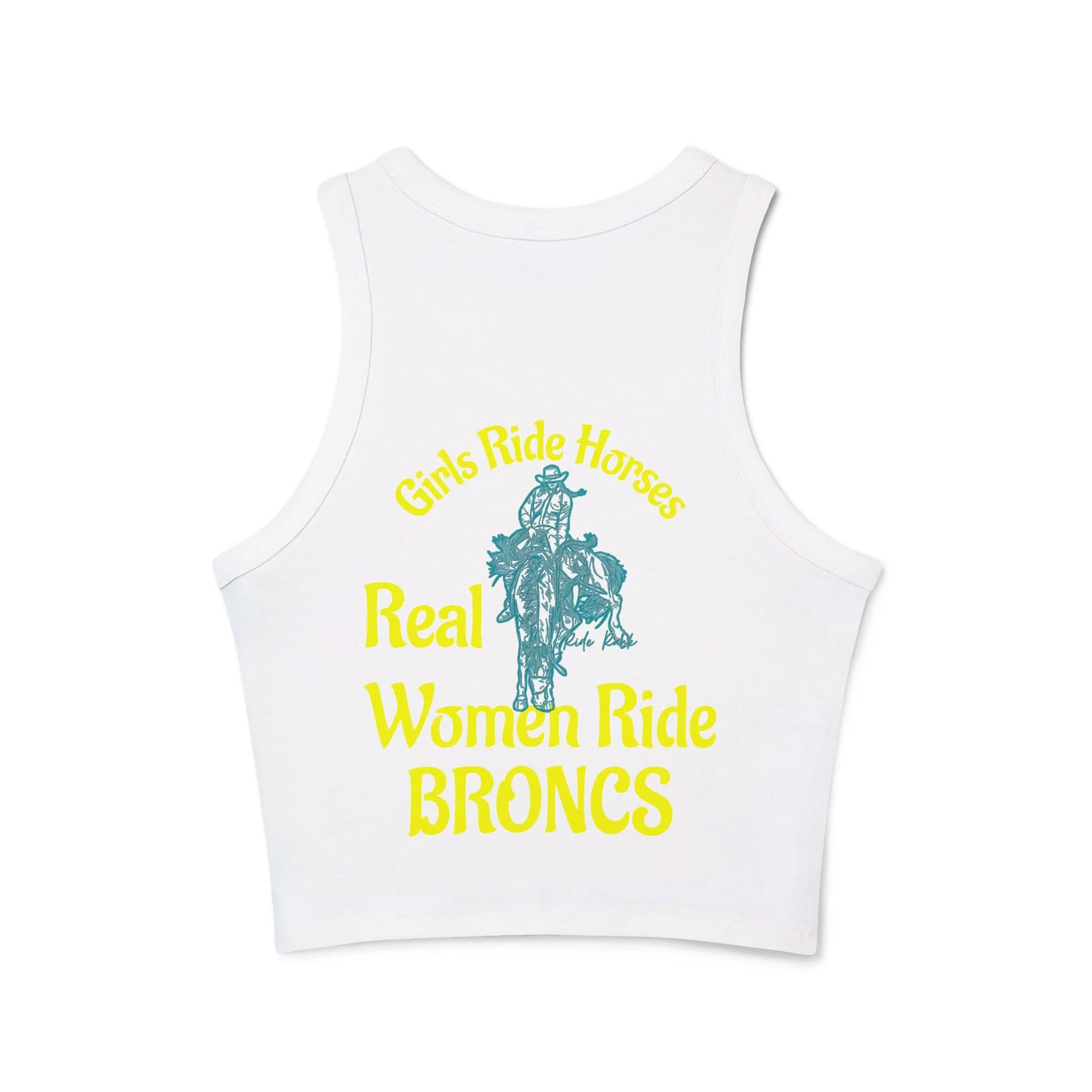 This cropped micro-rib racer tank brings western grit to a modern, sporty silhouette. Lightweight and fitted, it layers easily under jackets or stands alone while riding, roping, or cheering from the arena. The high neckline and mid-length cut keep things secure and flattering. Bold bronc and rider artwork in sunlit teal and golden yellow reads like a rallying cry: women who ride hard and ride proud. Soft Airlume cotton with reliable stretch keeps movement effortless; the DTF print stays vibrant through rides and washes. Wear it to practice, to the county fair, or on hot summer trail days — it feels lived-in from the first wear and keeps the attitude front and center.