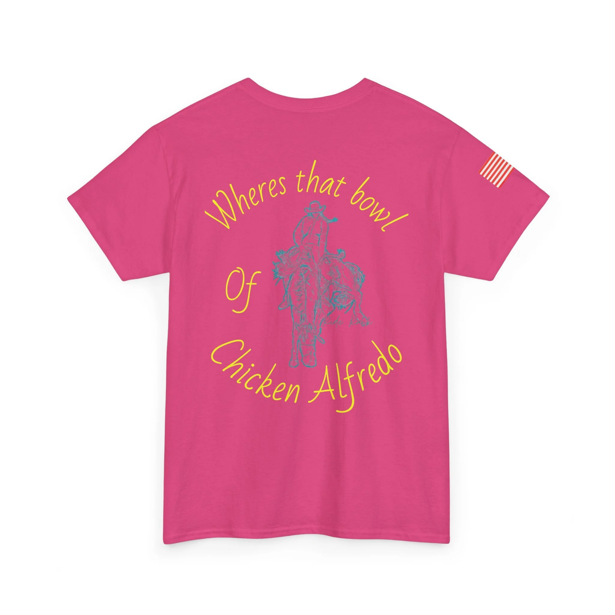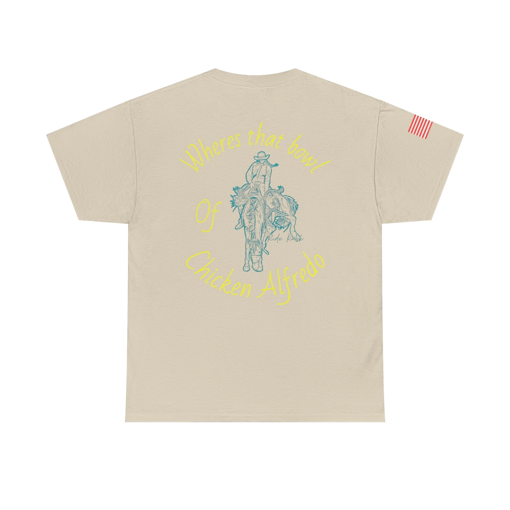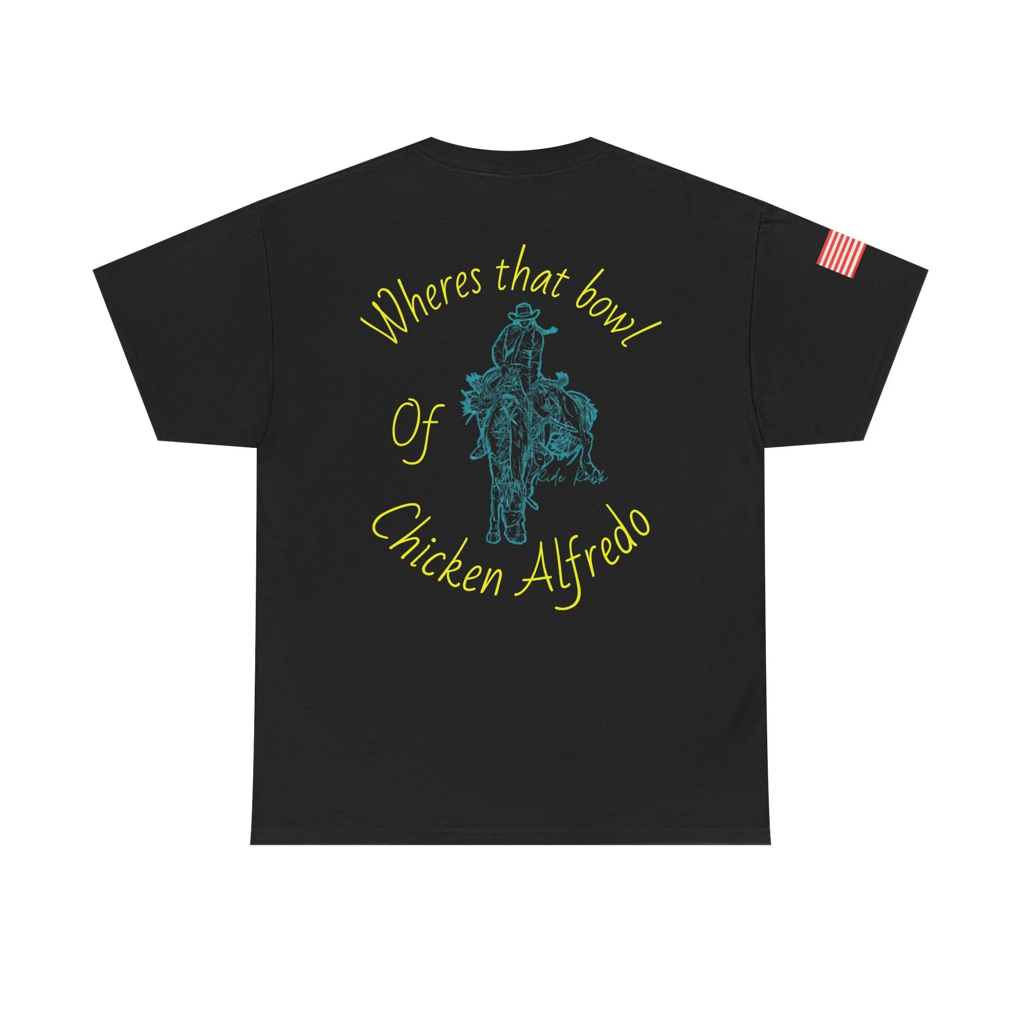 A relaxed, classic crew-neck tee that blends lighthearted western charm with everyday comfort. Soft, medium-weight cotton and clean printing showcase a playful desert donkey motif on the chest and a vintage-style rider illustration on the back with the phrase “Where’s that bowl of Chicken Alfredo” arched around it. The look is casual and a little irreverent — made to be worn at backyard hangs, roadhouse nights, or while wandering small towns. Subtle USA flag detail on the sleeve adds a touch of Americana, while the tear-away label and stable ribbed collar keep the shirt comfortable all day. Durable, ethically sourced fabric means this tee will hold its shape and color through repeated wears and washes.